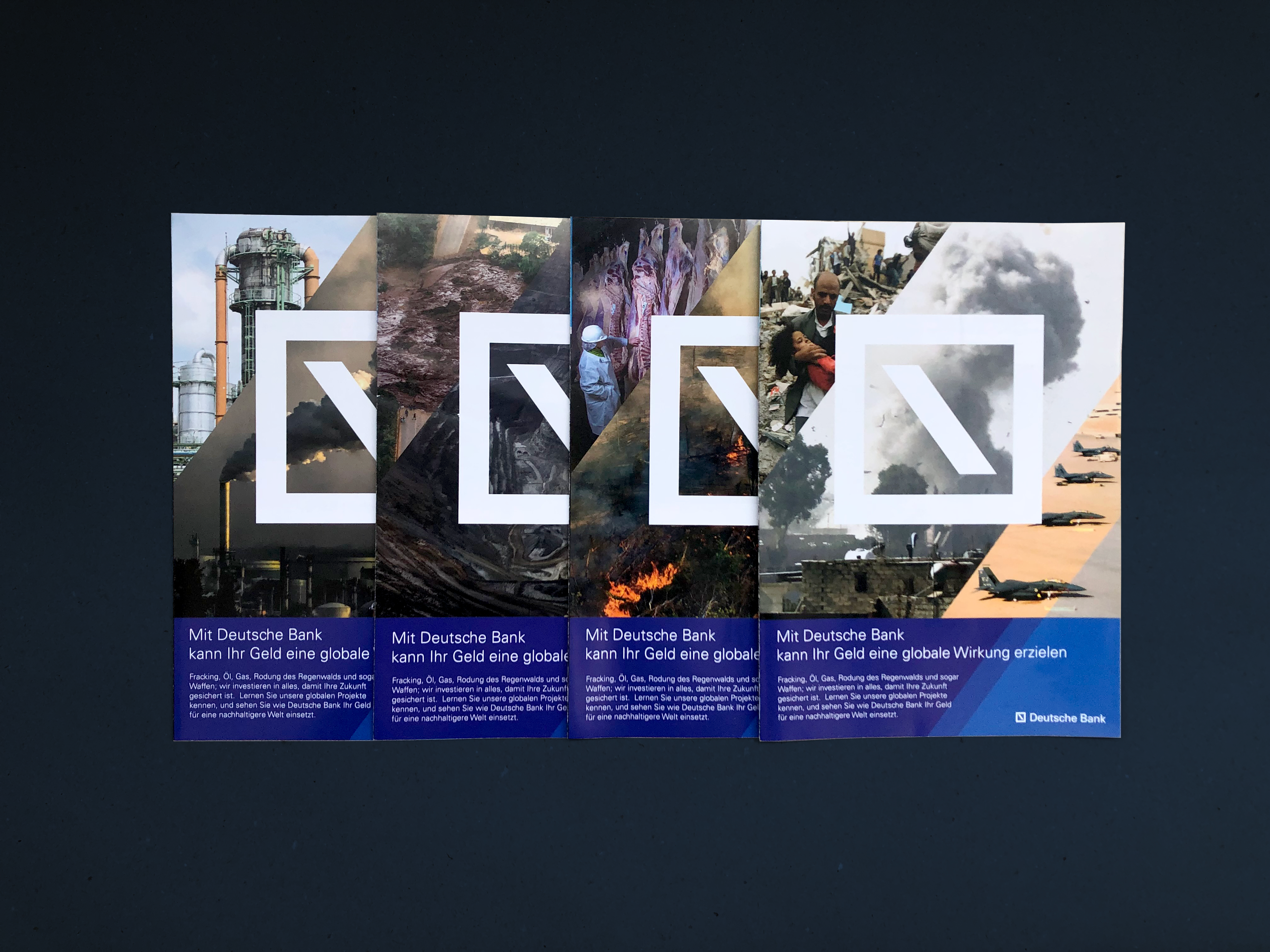 This is a campaign that encourages people to divest heir savings from one of the biggest fossil fuel investors in Europe. I designed leaflets and social media posts in the corporate branding of Deutsche Bank to spread the truth of Deutsche Banks investments. We then stood outside Deutsche Banks 'green' Headquarters in Berlin and handed out these flyers as bankers.
